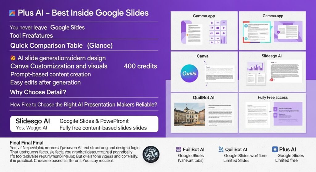 The best AI presentation maker free options in 2026 offer genuine productivity benefits. Gamma.app leads in speed. Canva dominates customization. Slidesgo AI supports traditional workflows. QuillBot AI provides full free access. Plus AI keeps everything inside Google Slides.